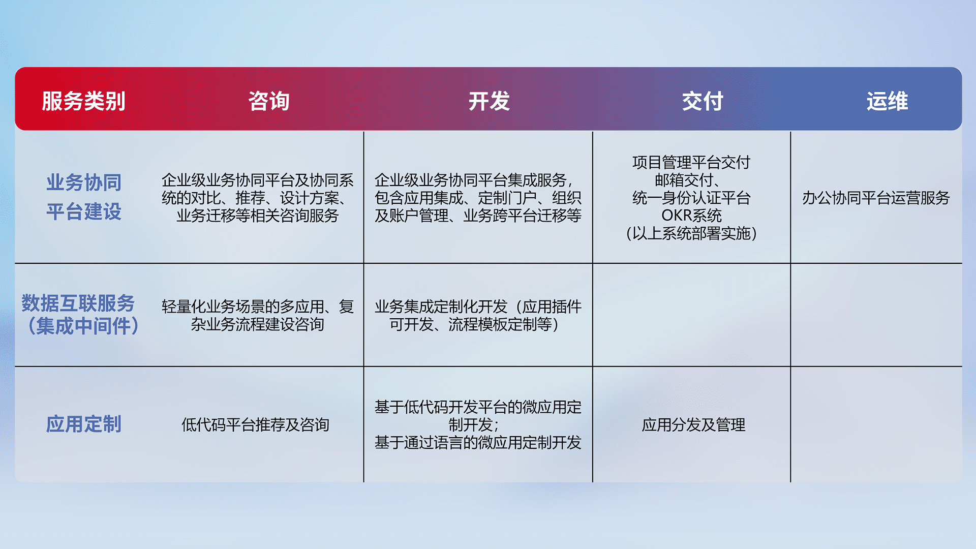 针对钉钉、、、企微、、IDaas等平台级产品提供产品的规划、、方案、、、、交付、、、、定制化开发等服务,,,,实现如统一协同办公、、、、智能客户服务、、、、混合会议管理、、、、智能数据查询、、等业务场景,,,实现数字化转型。。。。