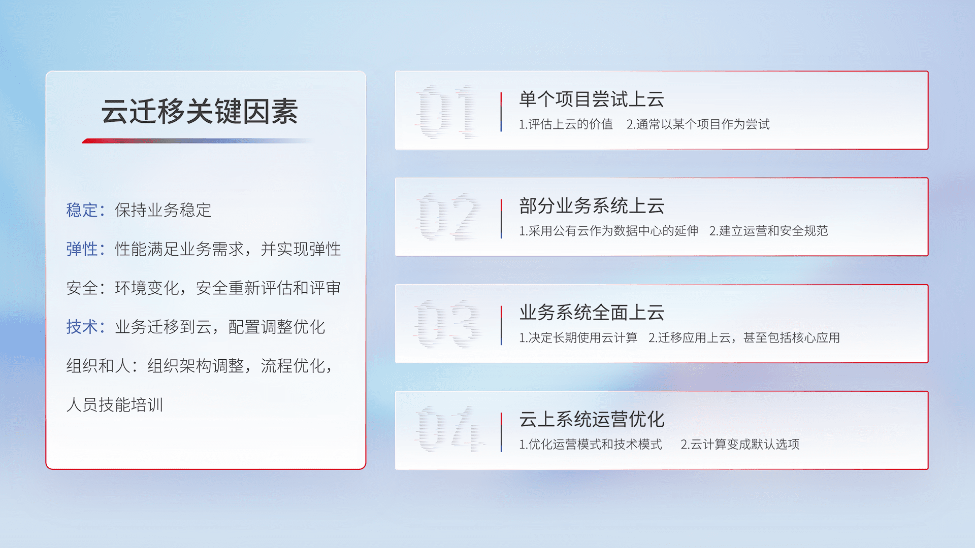 结合实际业务,,,从规划设计、、、云平台选型、、、、云原生改造、、、数据迁移、、、、集成交付,,迁移全过程为客户识别最佳上云路径,,,,做好风险识别管理,,,设计网络架构、、身份权限、、安全审计合规、、操作审计、、、日志审计、、、监控告警策略、、、、多站点容灾设计等,,对云上基础设施进行整体规划,,提升IT治理水平,,,以满足弹性、、、、高可用、、、、高性能的需求。。。。