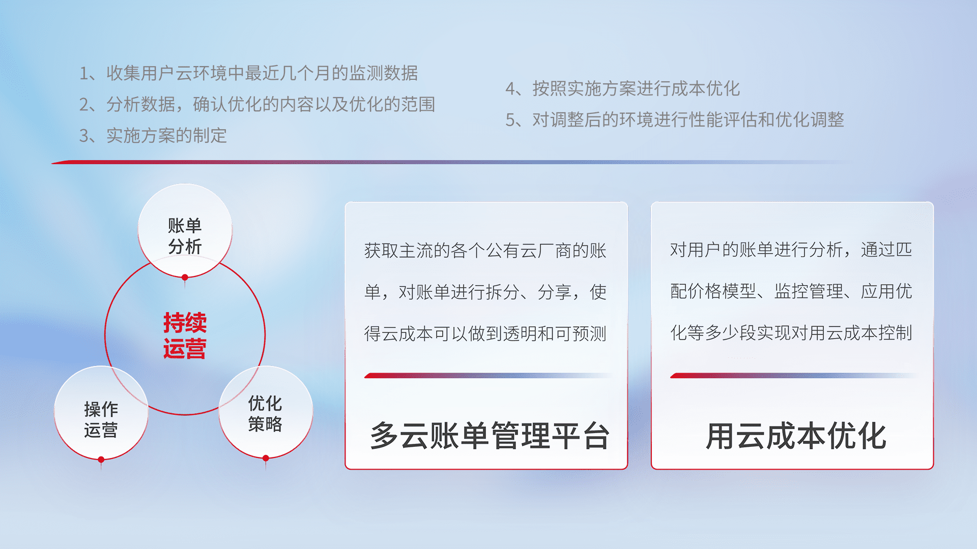 通过多云纳管,,以统一的资源数据模型把客户的云资源进行抽象和封装,,,,进而实现对多云资源的统一操作,,保障云资源管理的可靠性、、稳定性与可用性。。量身定制化运维内容,,,,配置、、、、开发运维、、、补丁管理、、、、备份、、、、监控、、认证和访问管理、、、审计和日常巡检等,,,保障在用云过程中的可靠度,,,,稳定度以及高可用率。。。。